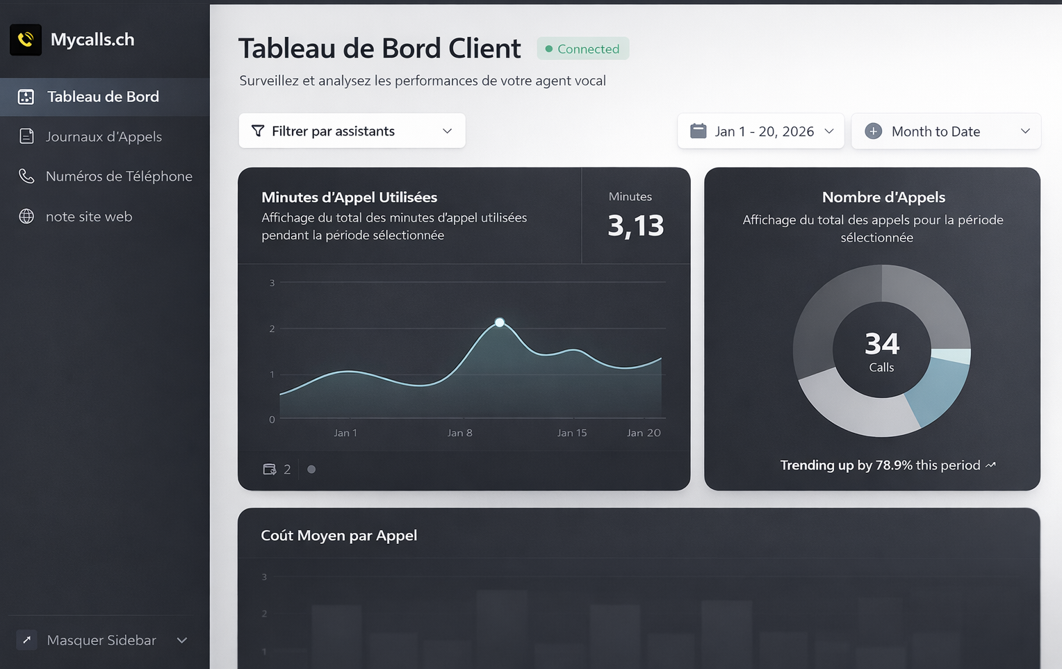 MyCalls est né d’un constat simple : les entreprises perdent des clients dès qu’elles ne répondent pas. Nous avons créé un assistant téléphonique doté d'intelligence artificielle et doté d'une voix tellement humaine qu’on oublie que c’est une IA, qui répond simultanément et immédiatement, qualifie, vend, prend les infos et rendez-vous et vous donne une vue claire dans un dashboard : appels, résumés, actions, performance.