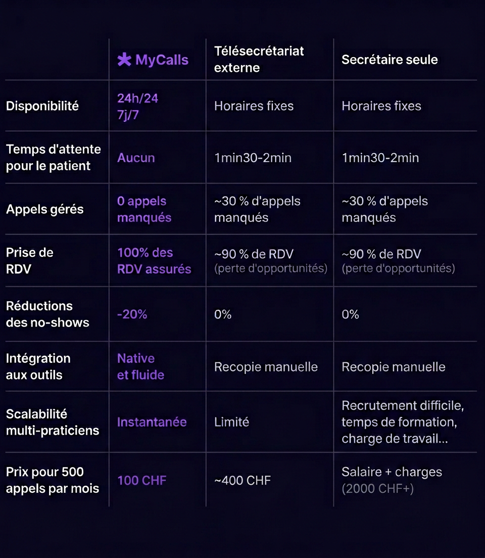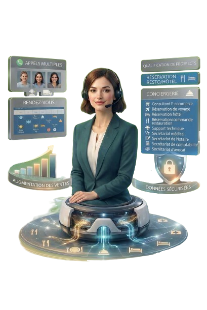 MyCalls effectue le travail de plusieurs personnes simultanément, répond instantanément, pose les bonnes questions, effectue des action pour vous, filtre les appels inutiles et vous envoie un récap clair (RDV, réservations, demandes, urgences).